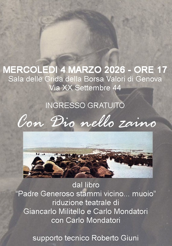 Mercoledì 4 marzo alle ore 17 nella Sala delle Grida di Palazzo della Borsa in via XX Settembre 44 andrà in scena la rappresentazione teatrale “Con Dio nello zaino”, monologo interpretato da Carlo Mondatori. L’ingresso all’evento è gratuito.
